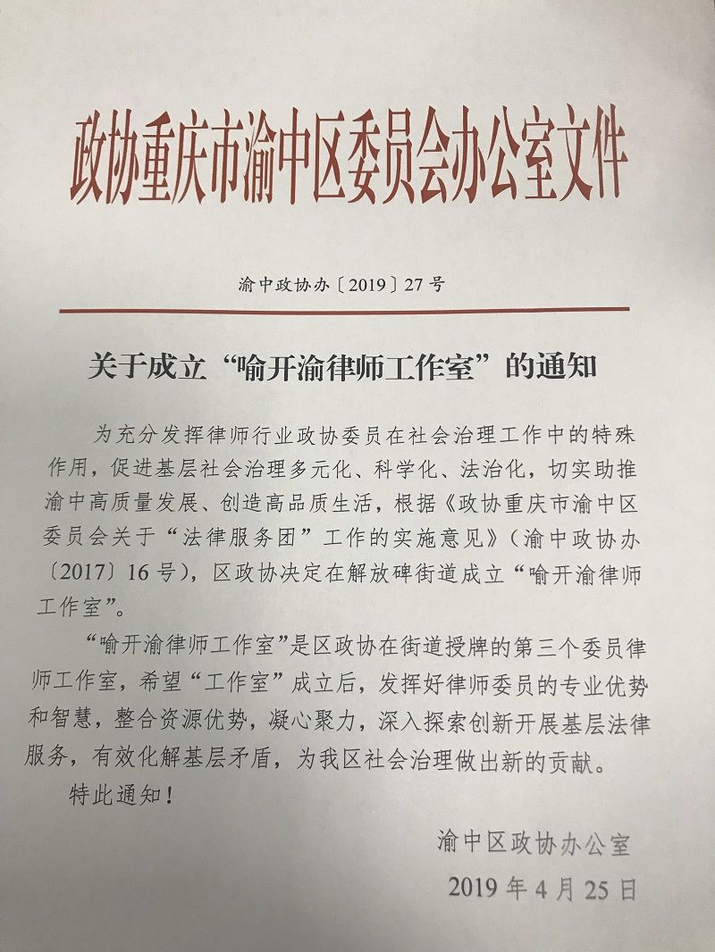 为充分发挥律师政协委员人才智力优势和作用,促进基层社会治理多元化、科学化和法治化,有效化解基层矛盾,助推高质量发展、创造高品质生活,渝中区政协优选委员律师,决定成立由市、区两级政协委员喻开渝担纲的工作室。